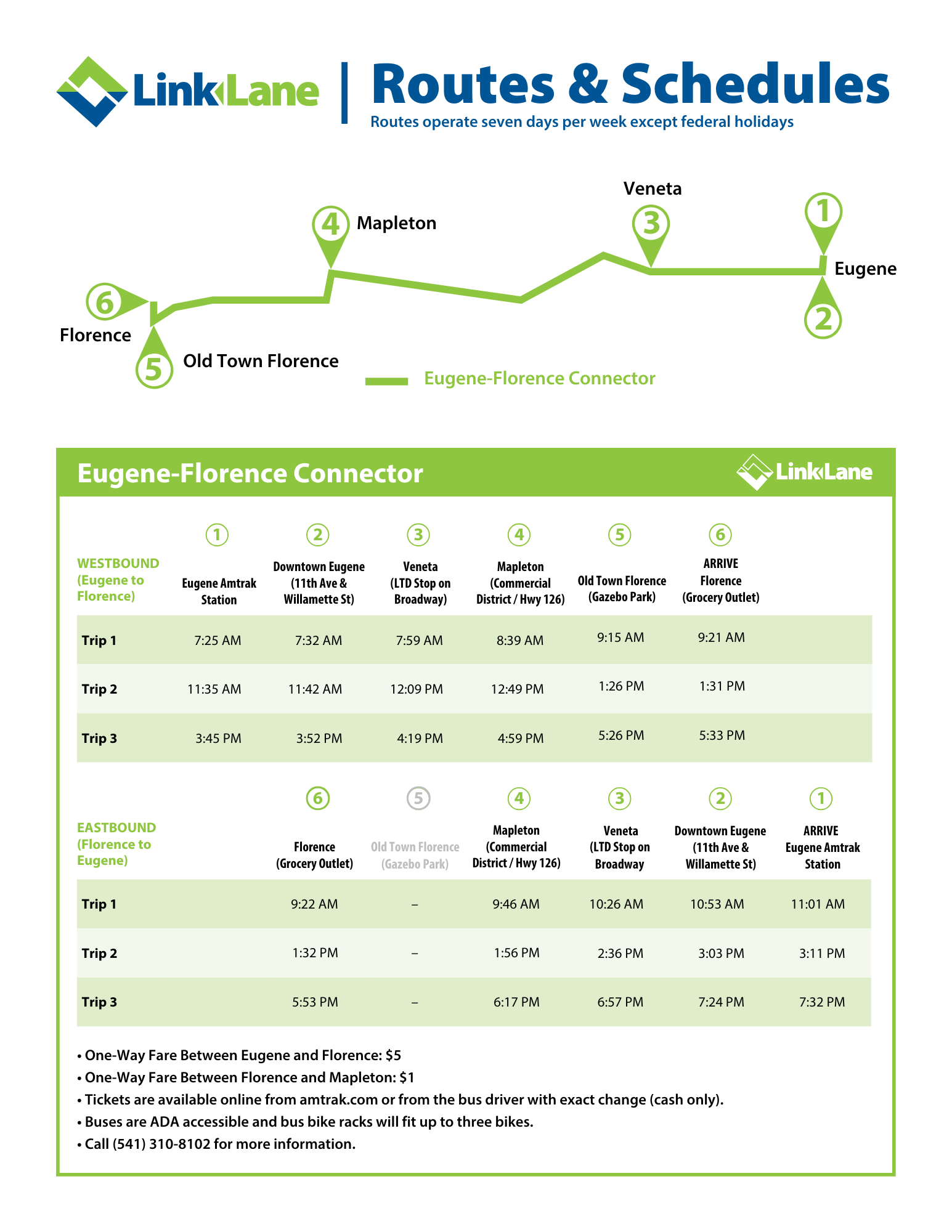 The Eugene-Florence bus currently runs seven days per week, with three roundtrip journeys per day. The schedule is updated as of October 2025.